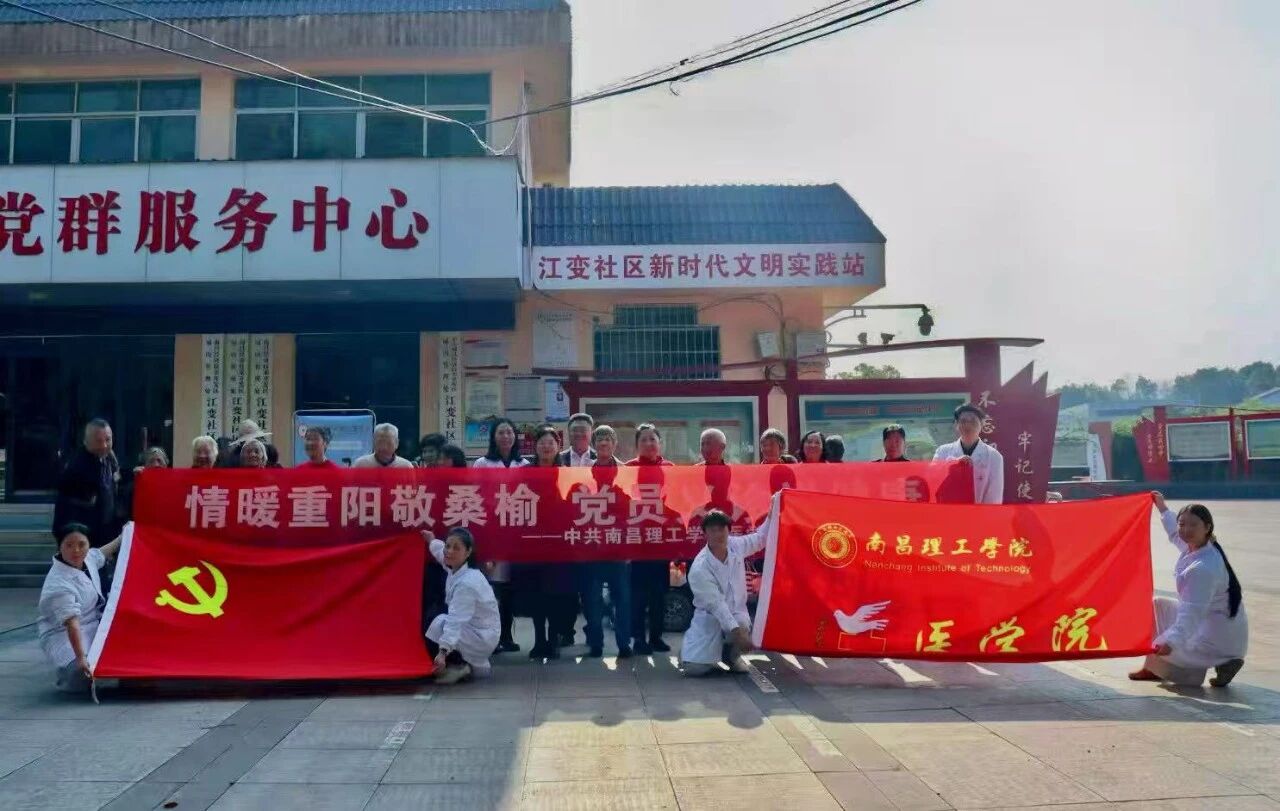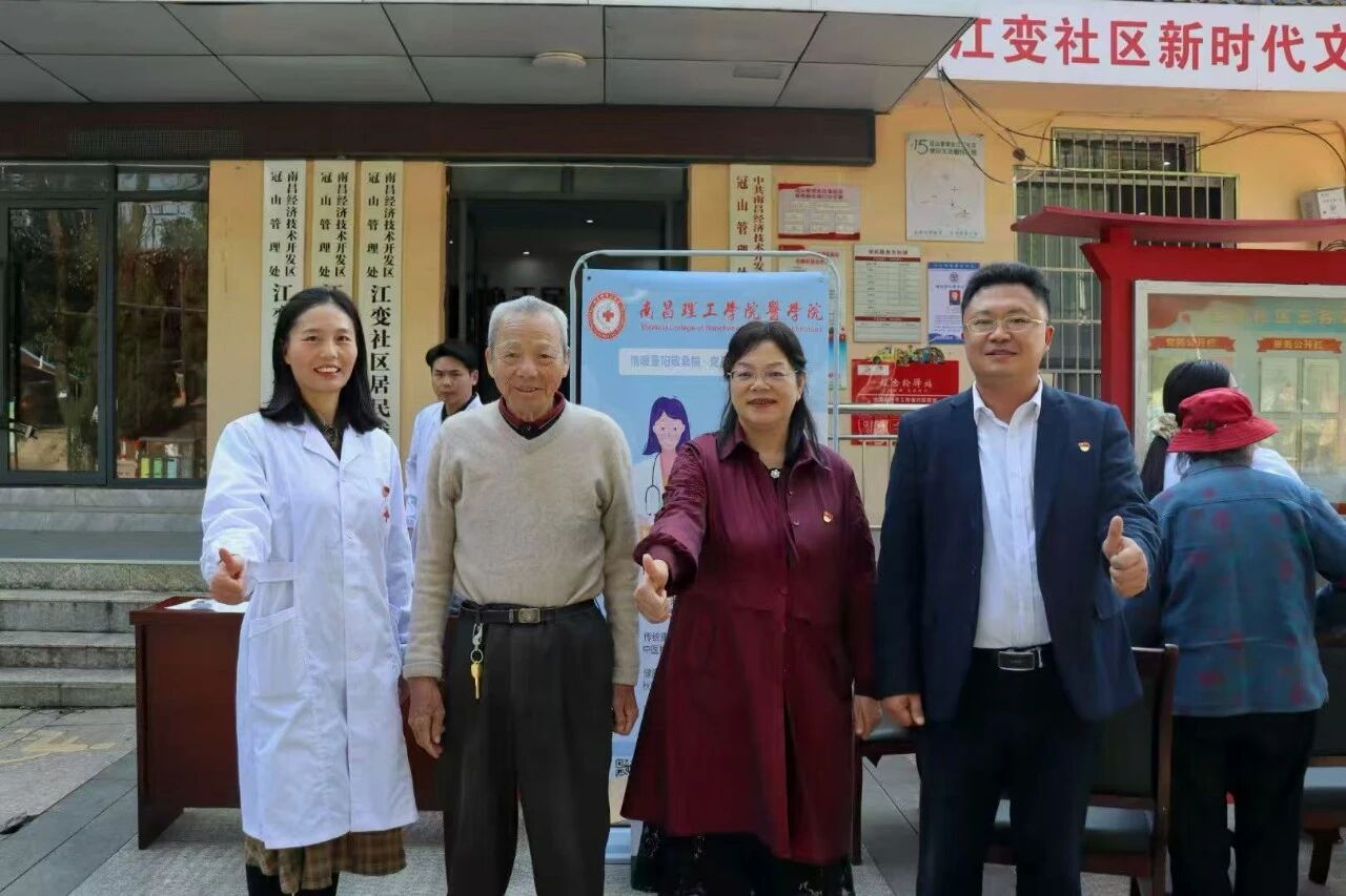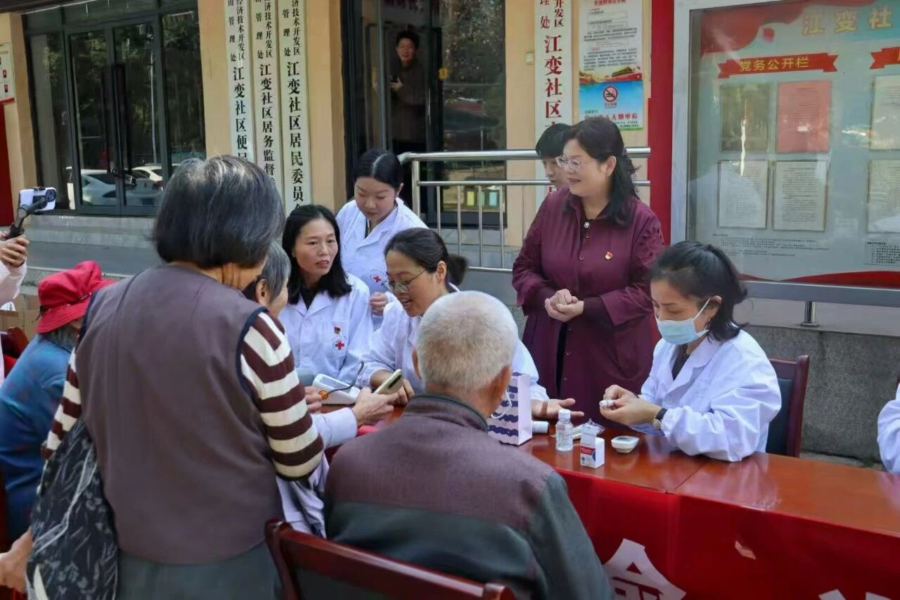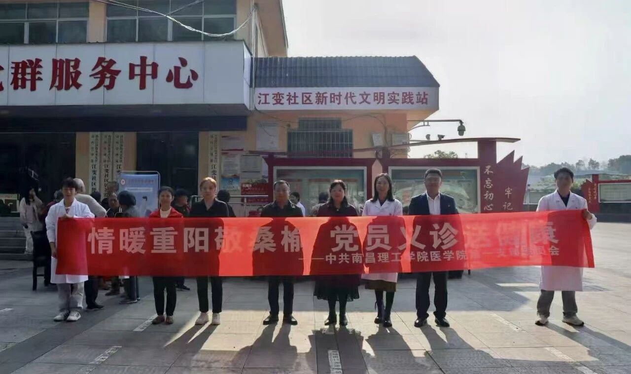 岁岁重阳,今又重阳。10月28日下午,医学院教师党支部组织师生党员及志愿者走进江变社区,开展了一场以“情暖重阳敬桑榆,党员义诊送健康”为主题的健康义诊活动。江变社区书记胡建武等领导对医学院一行的到来表示热烈欢迎。医学院党委书记刘国珍,党委委员、党政办主任王明辉,教师党支部书记刘霞,教师党支部委员聂宗冰以及师生党员代表参与活动,将专业的健康服务与温暖的节日祝福送到了社区老人身边。