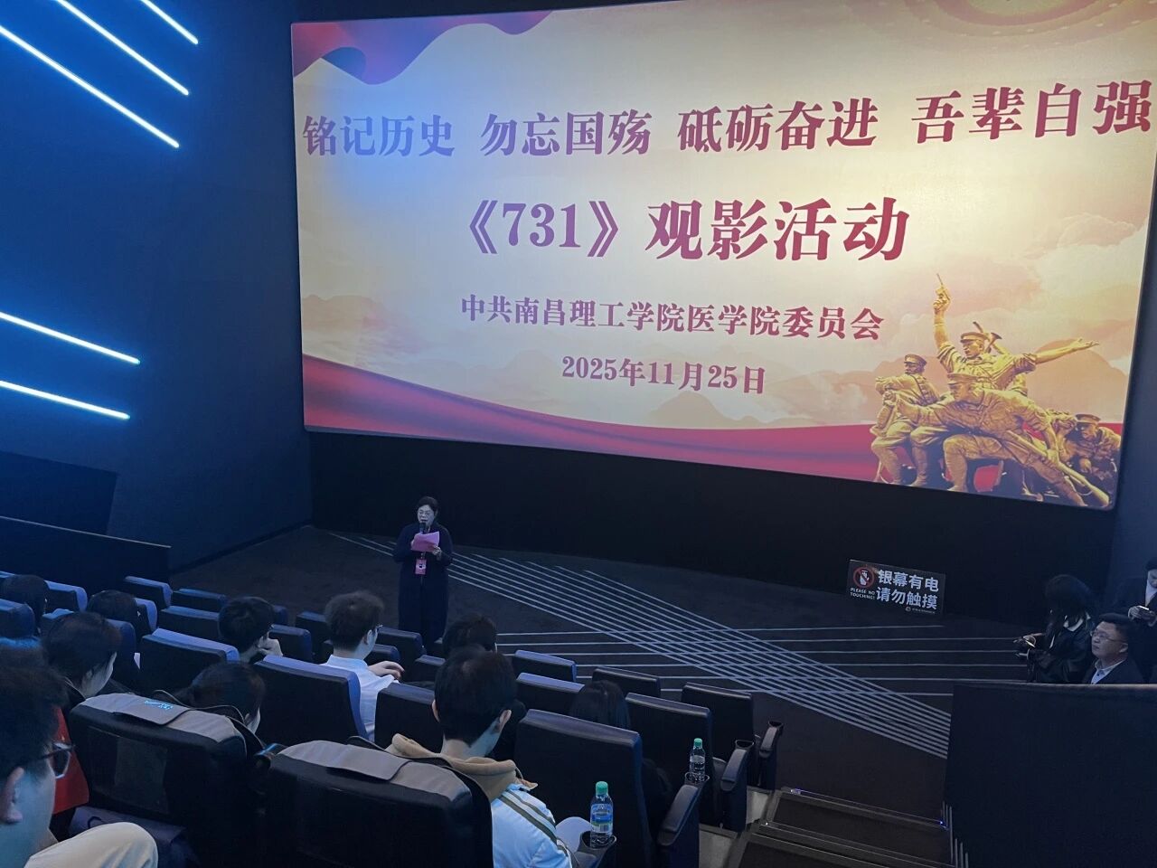 11月25日,医学院党委以“铭记历史 勿忘国殇 砥砺奋进 吾辈自强”为主题,组织师生党员、入党积极分子、团学骨干共计60人,集体观看历史题材影片《731》。此次活动旨在纪念中国人民抗日战争暨世界反法西斯战争胜利80周年,深化爱国主义教育,让师生们通过影片回溯侵华日军731部队的滔天罪行,以史为鉴砥砺初心使命。