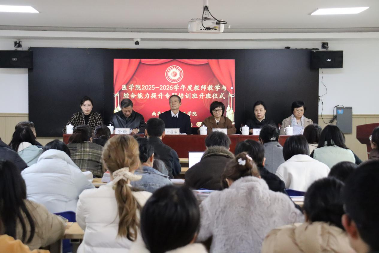 2025年12月30日下午,医学院于四楼会议室成功举行2025-2026学年度教师教学与综合能力提升专题培训班开班仪式。仪式特邀南昌大学康复学院院长、南昌大学附属康复医院院长、中国康复医学会副会长、中国康复医学会康复治疗学专业委员会主任委员冯珍教授,南昌大学第一附属医院康复医学科专家、中国康复医学会康复治疗专业委员会常务委员兼秘书长邵秀芹主任护师出席指导。医学院院长叶俊华教授、常务副院长涂映教授、副院长肖雪梅副教授、刘明珠副教授出席了开班仪式,全体专职教师参加。仪式由医学院常务副院长涂映教授主持。