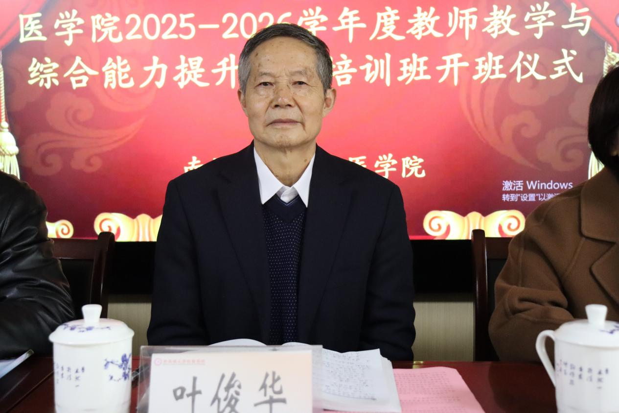 仪式最后,医学院院长叶俊华教授作总结动员讲话。他强调本次培训是提升教师教学能力与综合素质的关键举措,对于推动医学院教学改革、提高人才培养质量具有深远意义。他对参加培训教师提出三点要求:一是要高度重视,端正学习态度,从思想深处深刻认识培训的重要性;二是坚持问题导向,做到学以致用,结合自身教学实际,有针对性地进行学习和研究;三是要严格遵守培训制度,注重培训内容的复盘总结,以便在后续的学习和教学中不断改进和提高。叶俊华院长希望各位老师以更加饱满的精神状态投入到培训中,努力提升自身能力,为医学院的发展贡献。